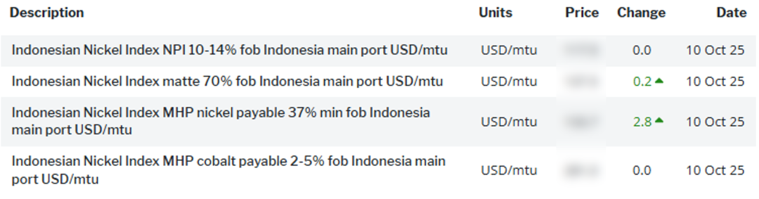 阿格斯印尼镍指数(简称INI指数)包含不同品位的二级镍和中间品的周度价格评估,即基于fob印尼的:
